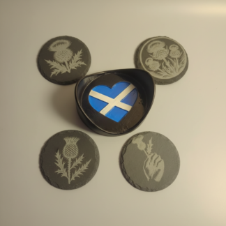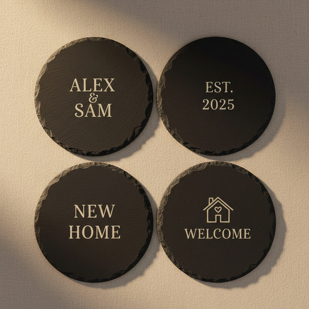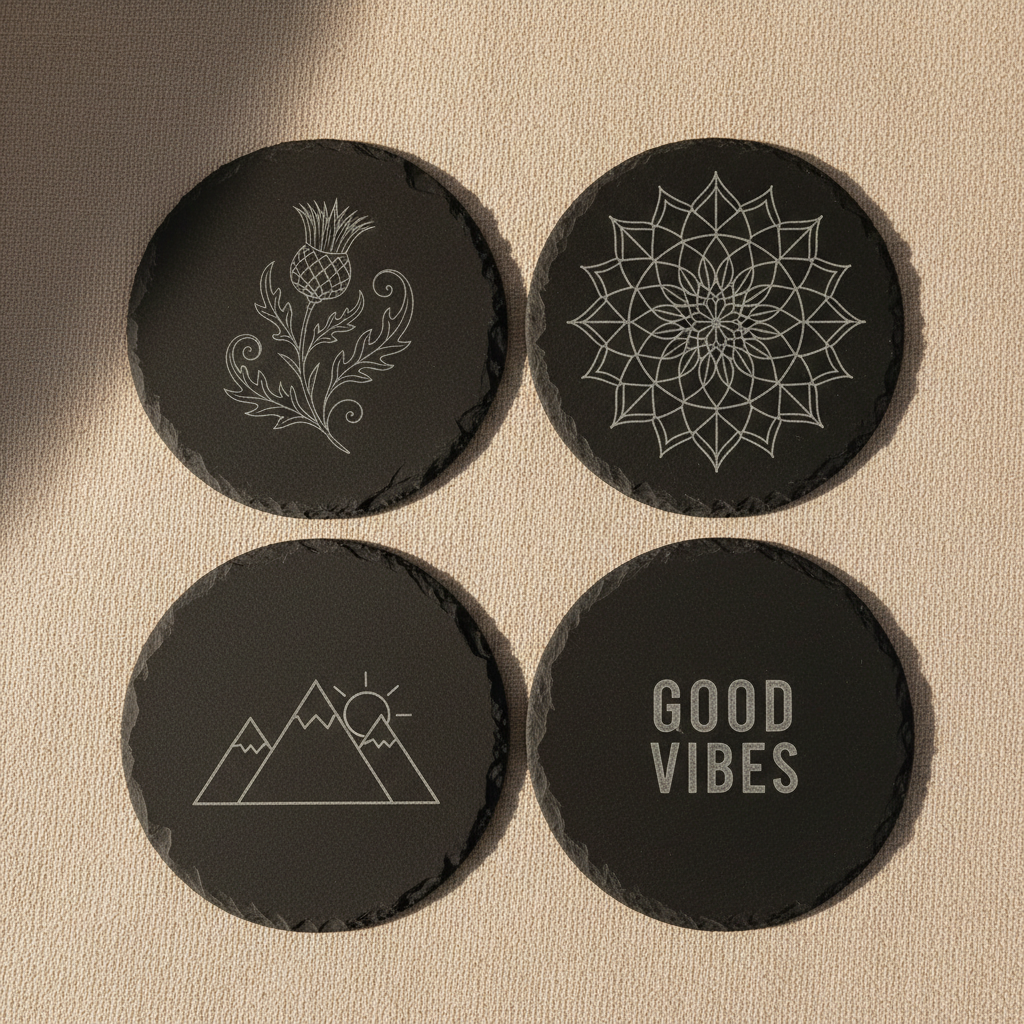 • 4 round slate coasters, laser-engraved